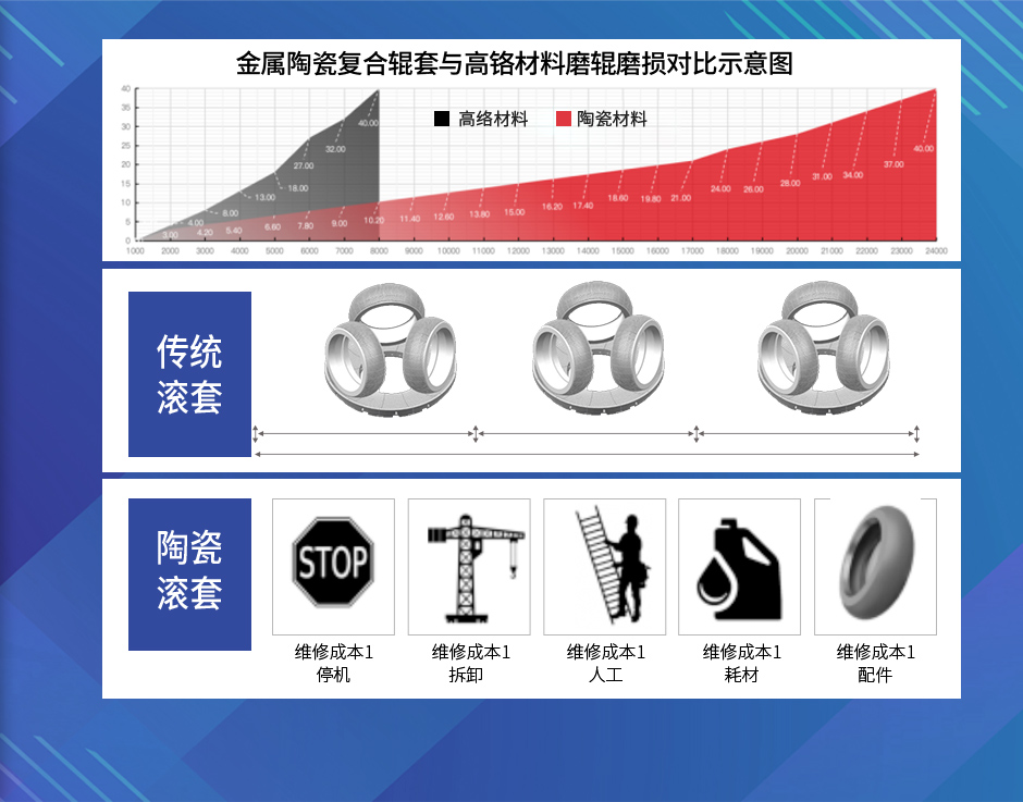 • 陶瓷復(fù)合輥套是堆焊/高鉻輥套使用壽命2.0-3.0倍